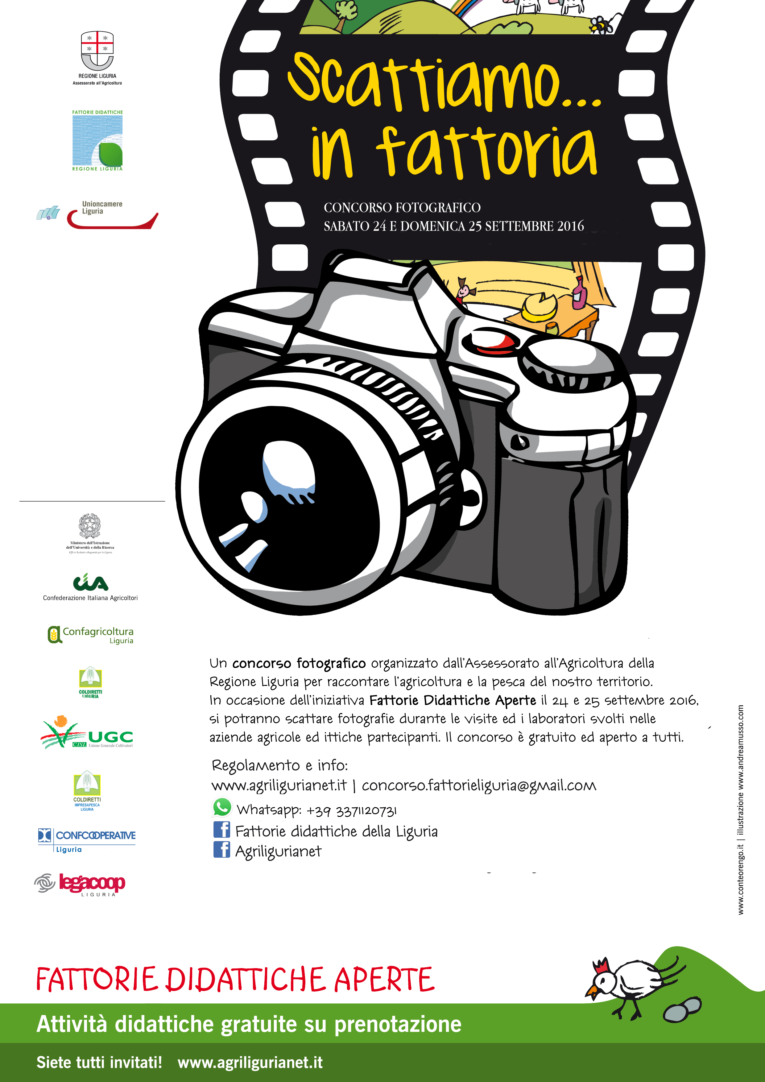 Parte integrante dell’evento è il concorso fotografico "Scattiamo... in fattoria". Per partecipare è sufficiente il 24 e il 25 settembre immortalare la propria visita e inviare al massimo tre foto in formato digitale a concorso.fattorieliguria@gmail.com o al numero Whatsapp 3371120731 entro il 31 ottobre 2016. Il concorso è gratuito e rivolto a tutti. Modulistica e regolamento scaricabili di seguito. I vincitori avranno come premi dei prodotti tipici dell'agricoltura ligure.